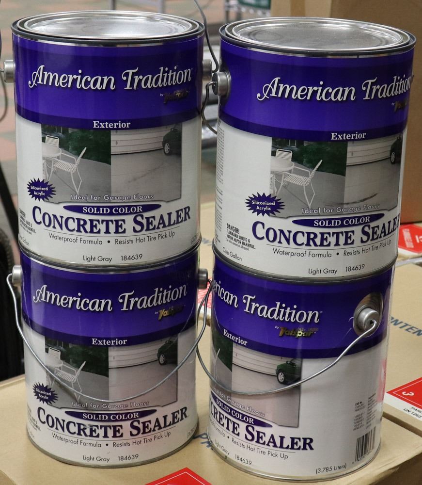 BOX OF FOUR 1 GAL CANS OF CONCRETE STAIN. GREY.