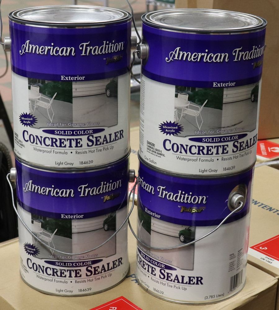 BOX OF FOUR 1 GAL CANS OF CONCRETE STAIN. GREY.
