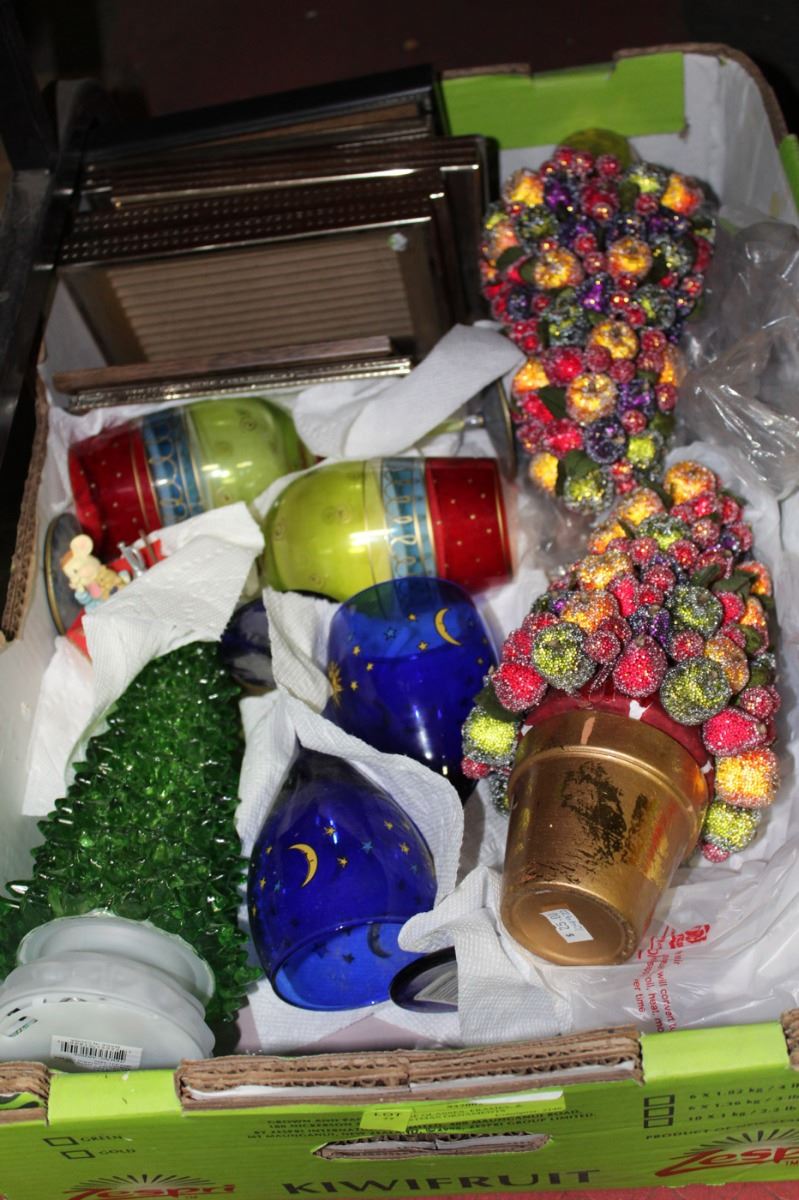 BOX OF GLASSES, FRAMES, & CHRISTMAS ORNAMENTS