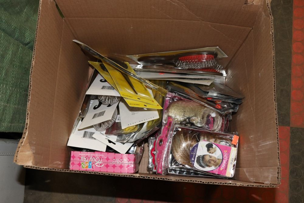 BOX OF HAIR BRUSHES AND ARTIFICIAL HAIR