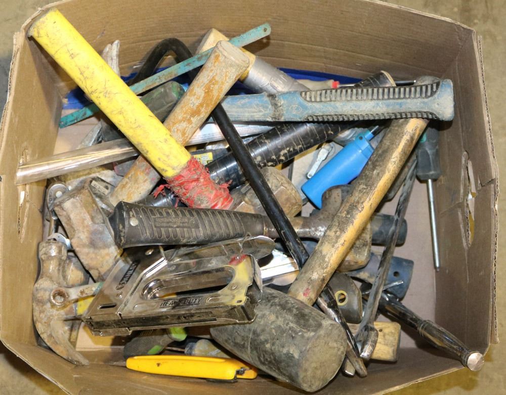 BOX OF HAMMERS AND VARIOUS TOOLS