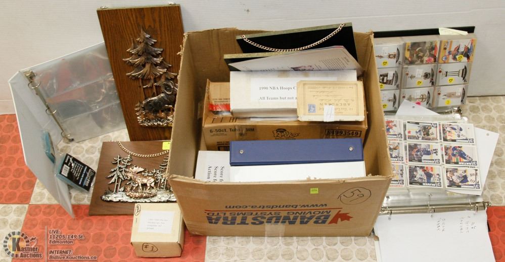 BOX OF HOCKEY CARDS AND WALL HANGINGS