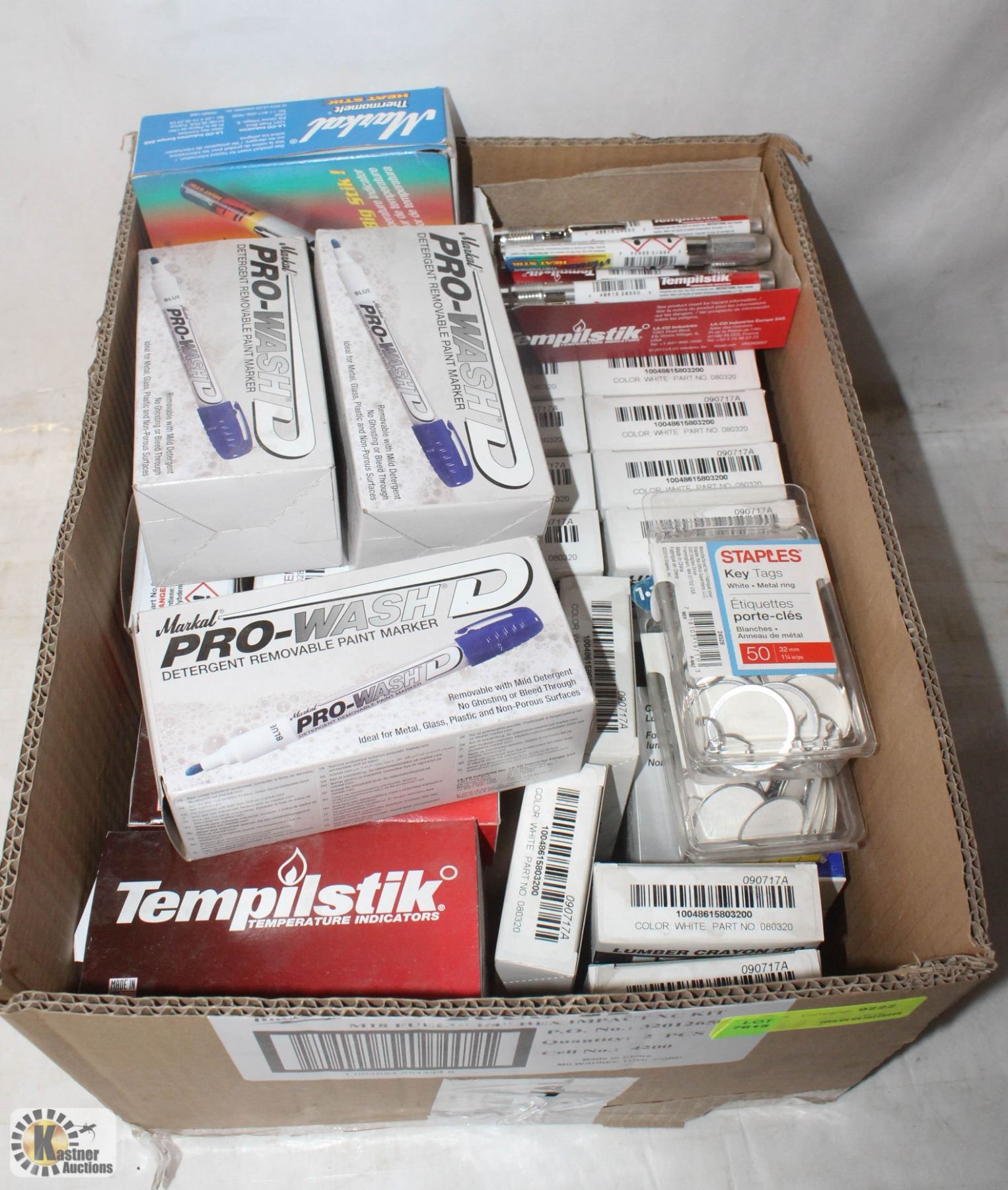 BOX OF KEY TAGS, PAINT MARKERS AND MORE