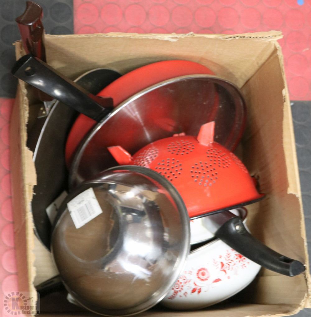 BOX OF KITCHEN ITEMS INC POTS, PANS AND A STRAINER