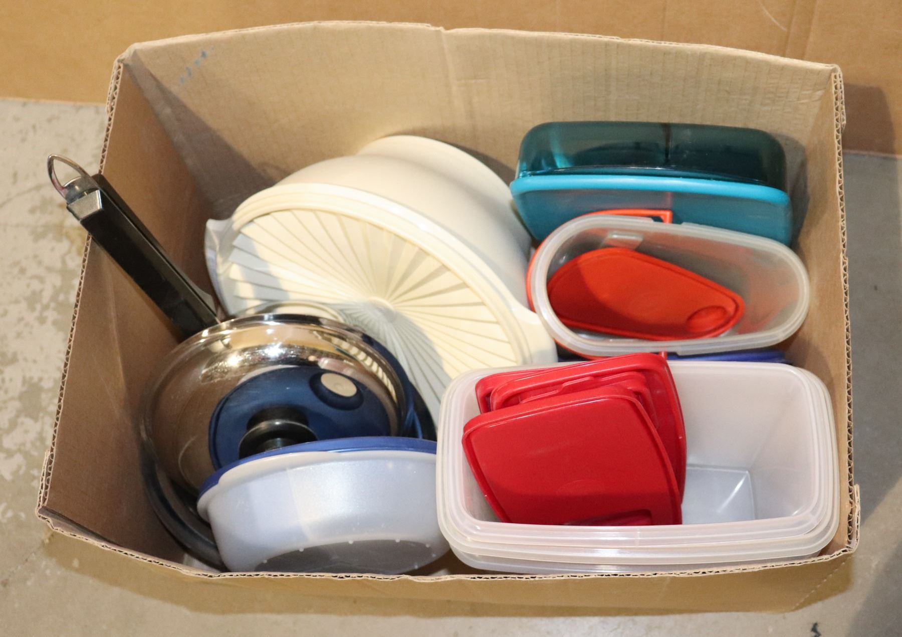 BOX OF KITCHEN ITEMS, POT, STORAGE ITEMS, ECT