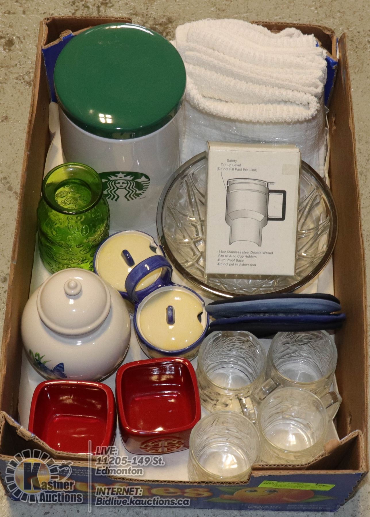 BOX OF KITCHENWARE INCL. 8 WASHCLOTHS, LARGE STARBUCKS CANISTER, NEW TRAVEL MUG, CONDIMENTS SET, 4-