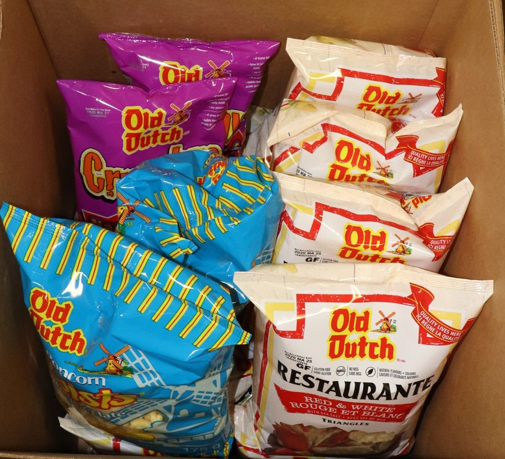 BOX OF LARGE BAGS OF CHIPS, POPCORN TWISTS,