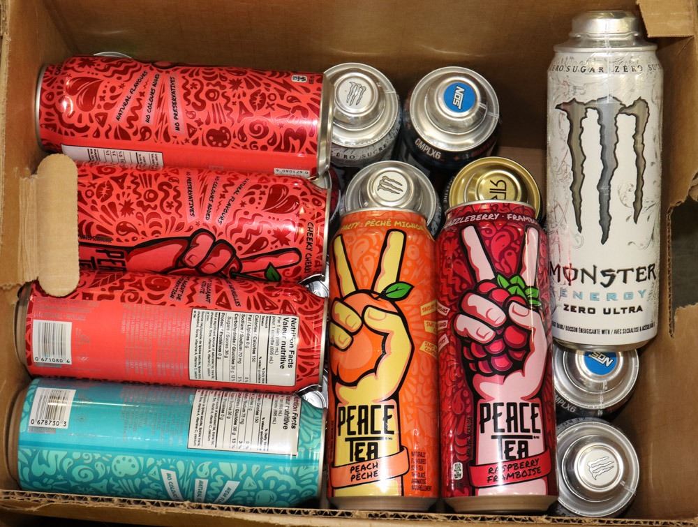 BOX OF LARGE CANS OF MONSTERS & PEACE TEAS