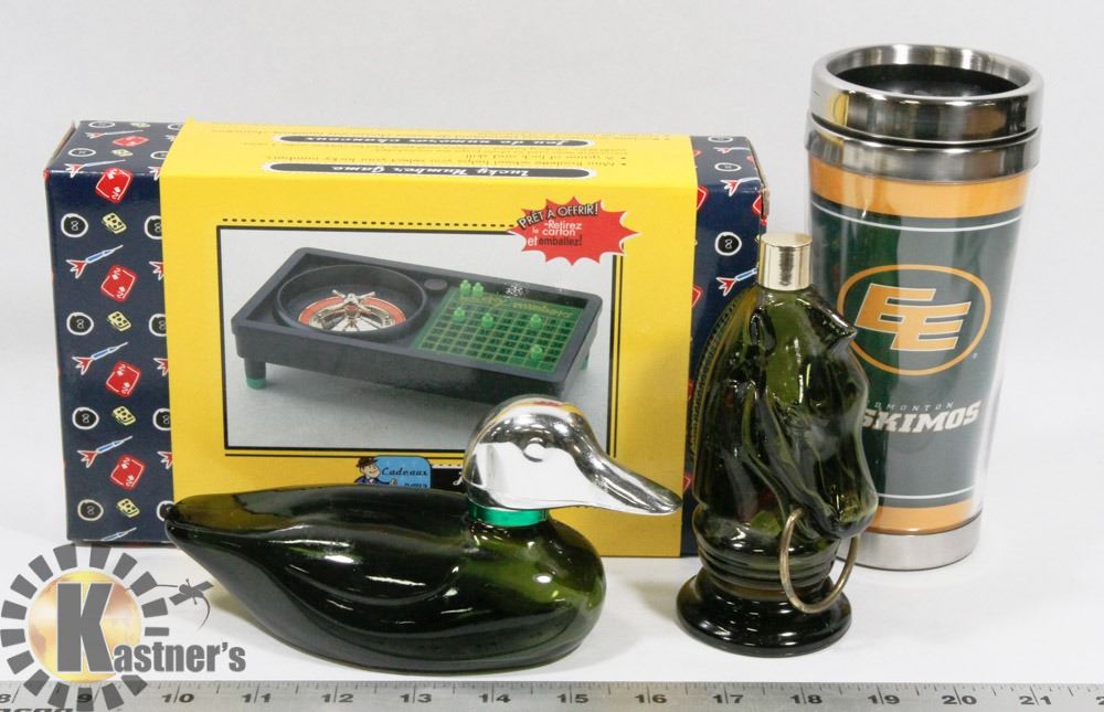 VINTAGE AVON DECANTERS, NEW FACTORY SEALED GAME, EDMONTON ESKIMOS TRAVEL MUG
