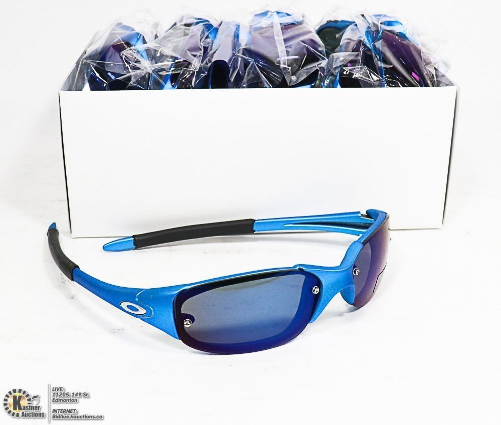 BOX OF METALLIC BLUE OAKLEY STYLED SUNGLASSES