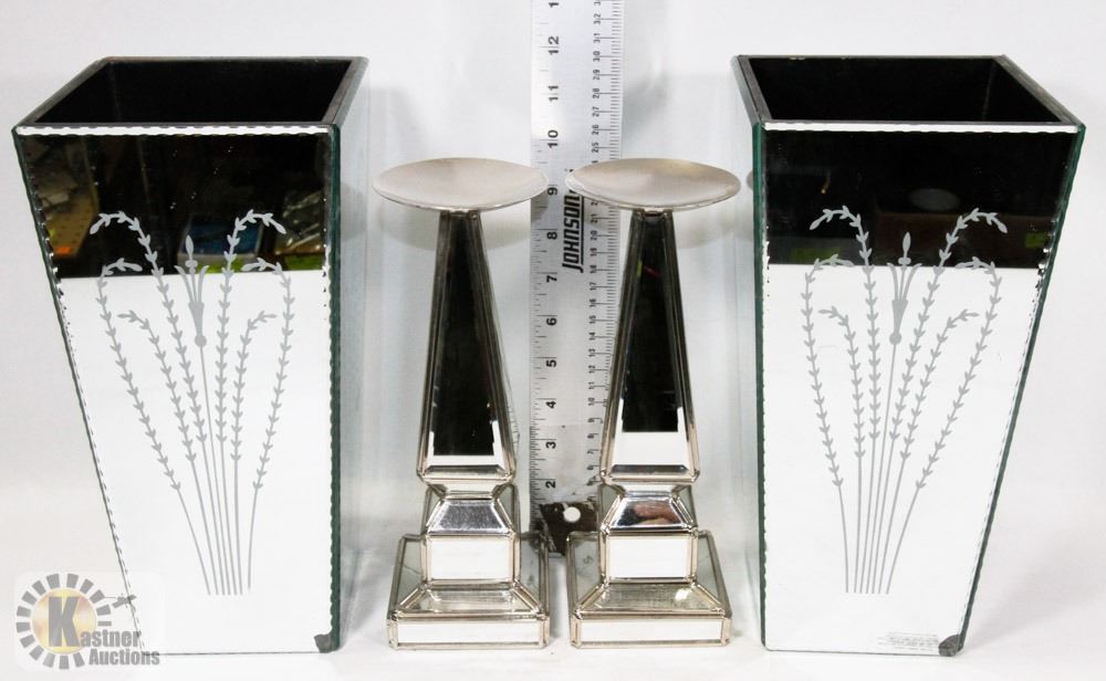 BOX OF MIRROR VASES AND CANDLE HOLDERS