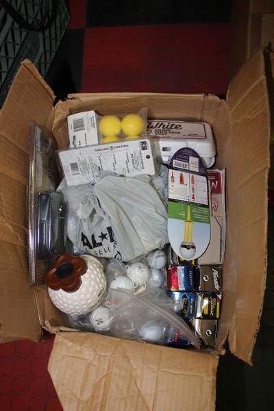 BOX OF MISC GOLF SUPPLIES SOLD WITH GOLF CADDY