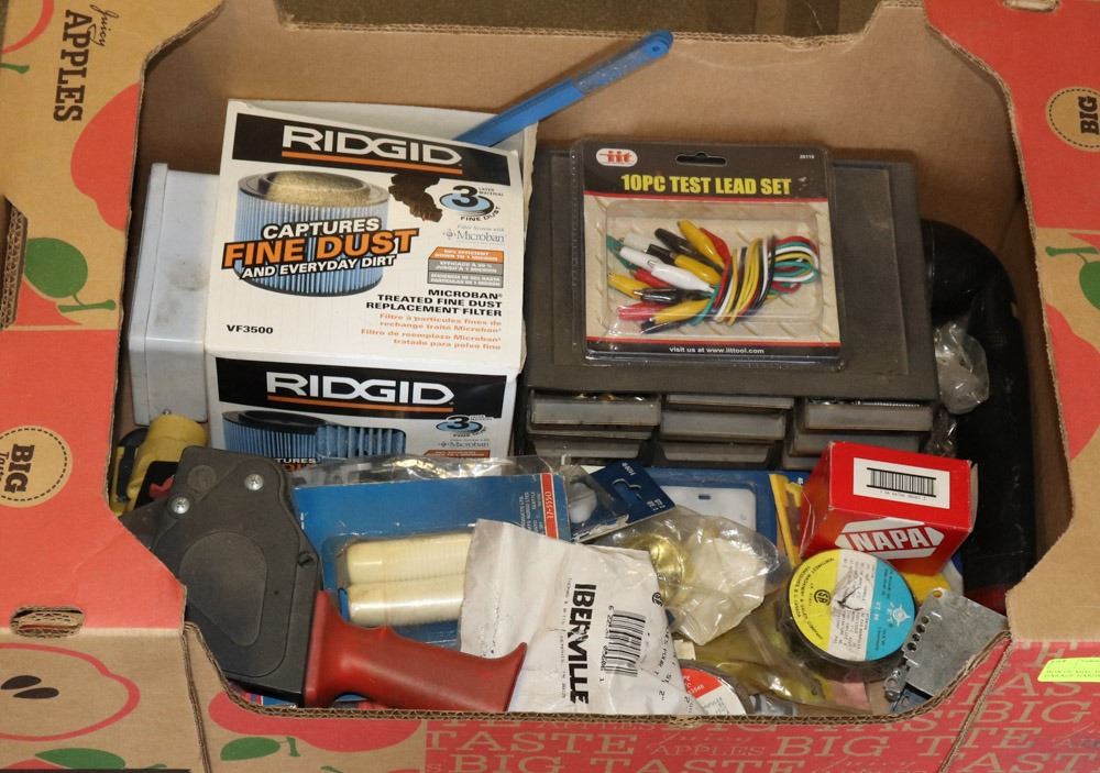 BOX OF MISC HOUSEHOLD AND GARAGE HARDWARE, 9 DRAW