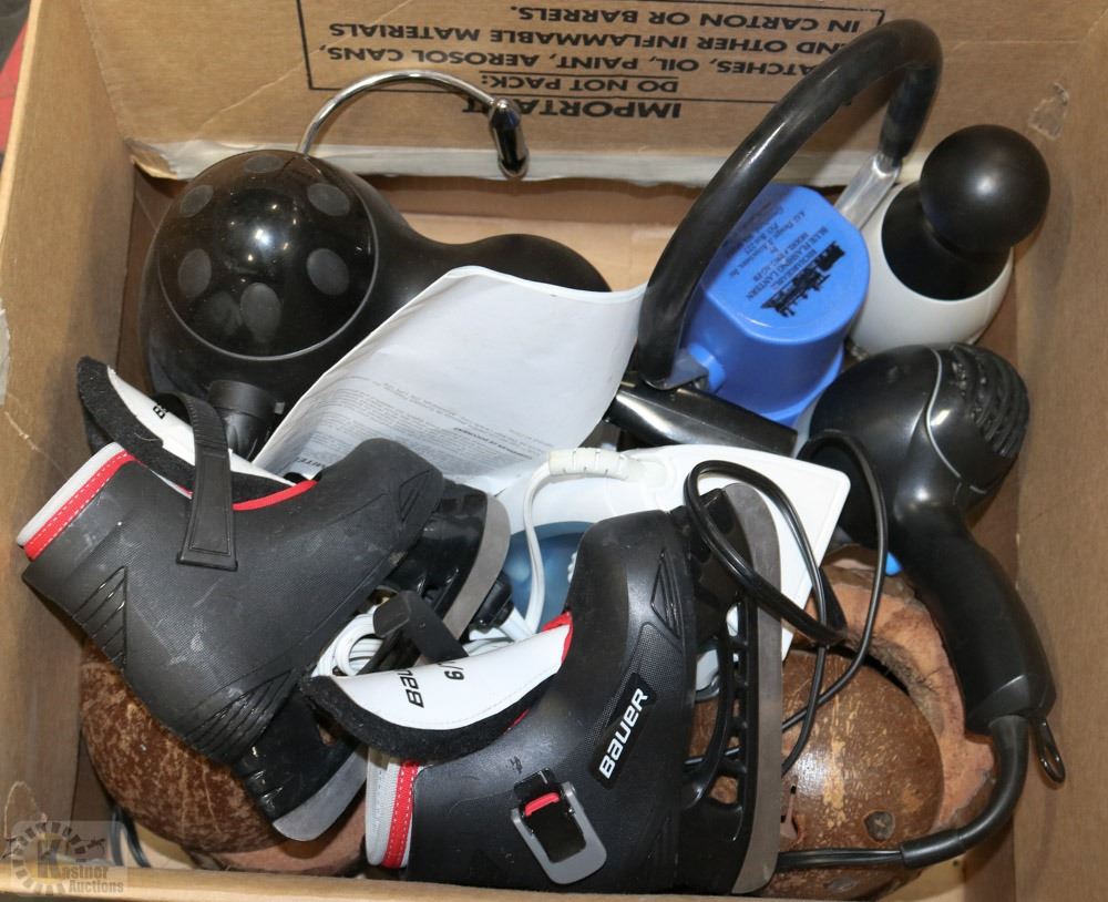 BOX OF MISC INC SLAP CHOP SET, IRON & KIDS SKATES