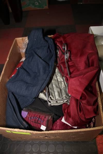 BOX OF MISC. SHOWER RINGS AND FABRIC