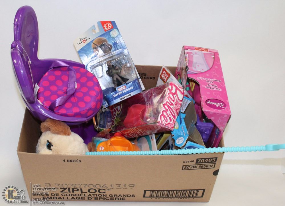 BOX OF MISC TOYS INCL BARBIE, DISNEY ETC
