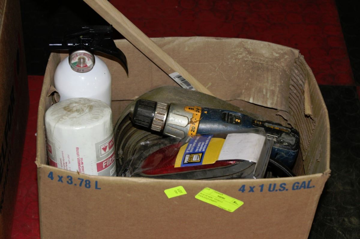BOX OF MISC. VEHICLE TOOLS/EQUIPMENT