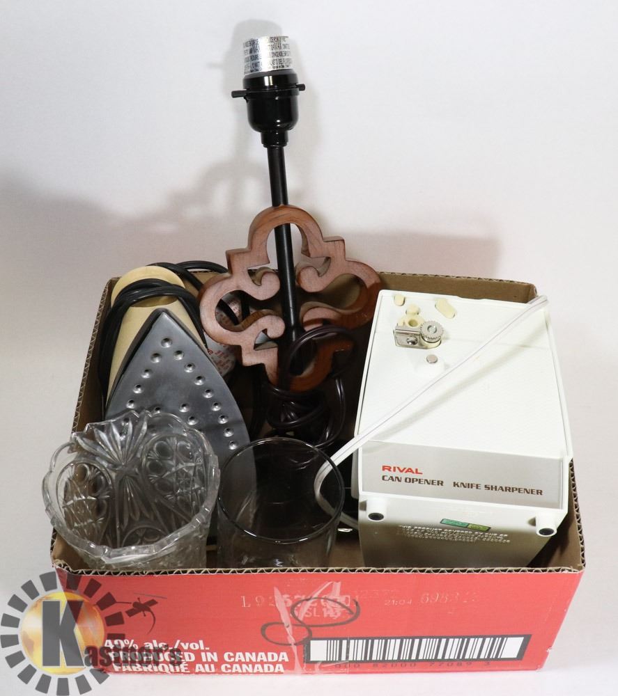 ELECTRIC IRON; LAMP; ELECTRIC CAN OPENER WITH KNIFE SHARPENER