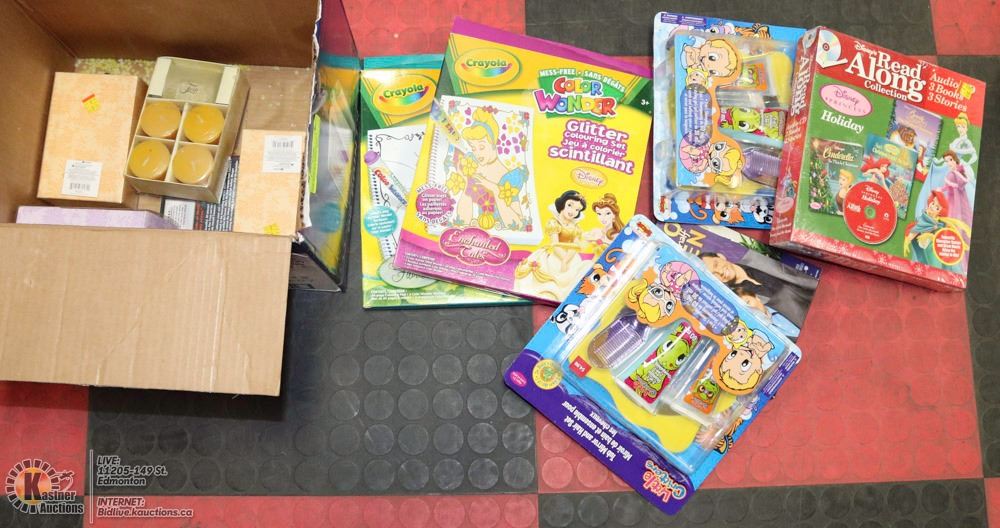 BOX OF NEW CANDLES,SHAMPOO KITS, DVD'S AND MORE