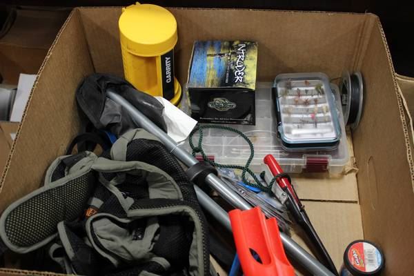 FISHING VEST, TACKLE BOXES, FLIES, HOOKS, FOLDING CHAIR ETC.