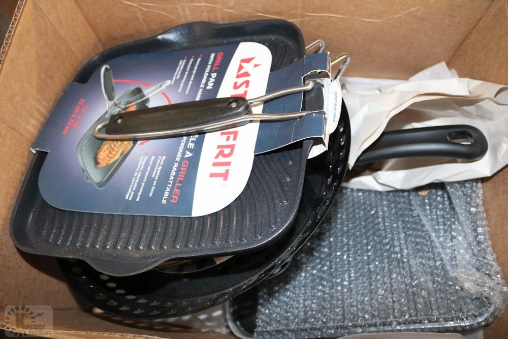 BOX OF NEW FRYING PANS ETC