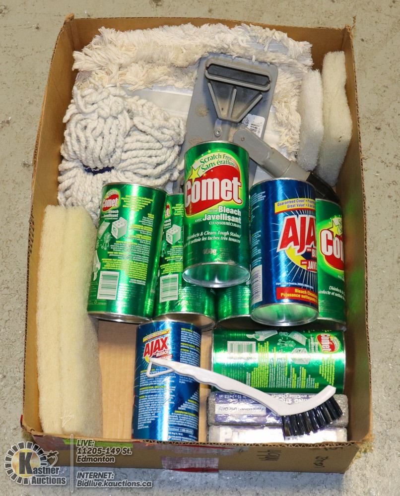 ACCESSORIES INCL. 8X TINS OF COMET AND AJAX DISINFECTANT CLEANERS, 4 PUMIE SCOURING STICKS FOR PORCELAIN AND TILE, WALL WASHING TOOL WITH SHOWER SCRUBBERS, BRUSHES, ETC.