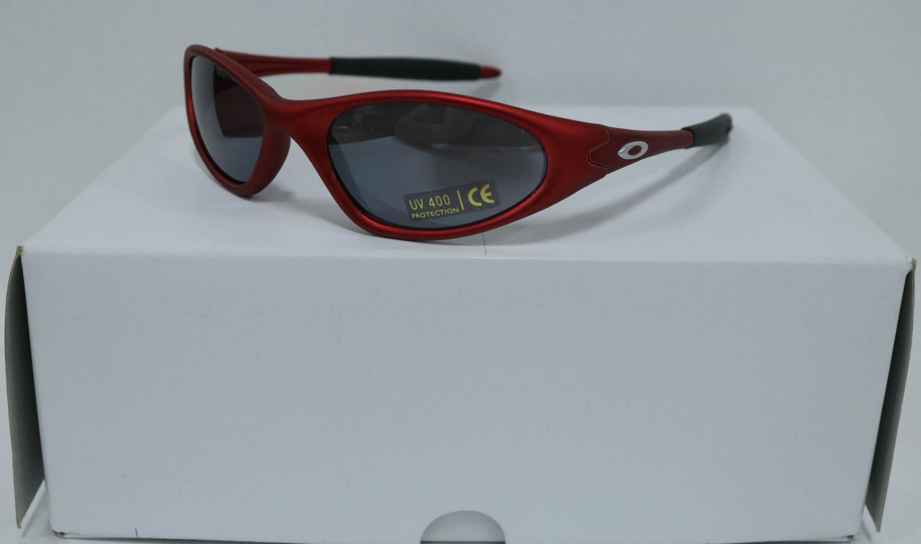 BOX OF OAKLEY STYLE RED DESIGNER SUNGLASSES