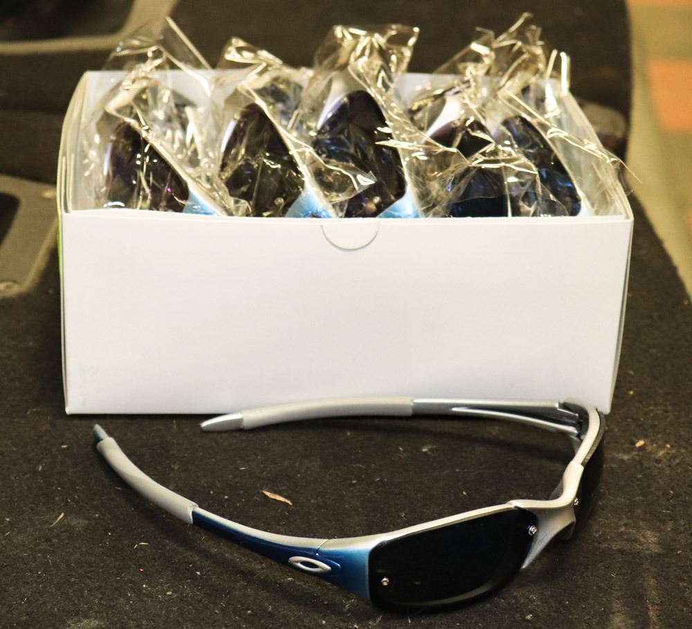 BOX OF OAKLEY STYLED BLUE & SILVER SUNGLASSES