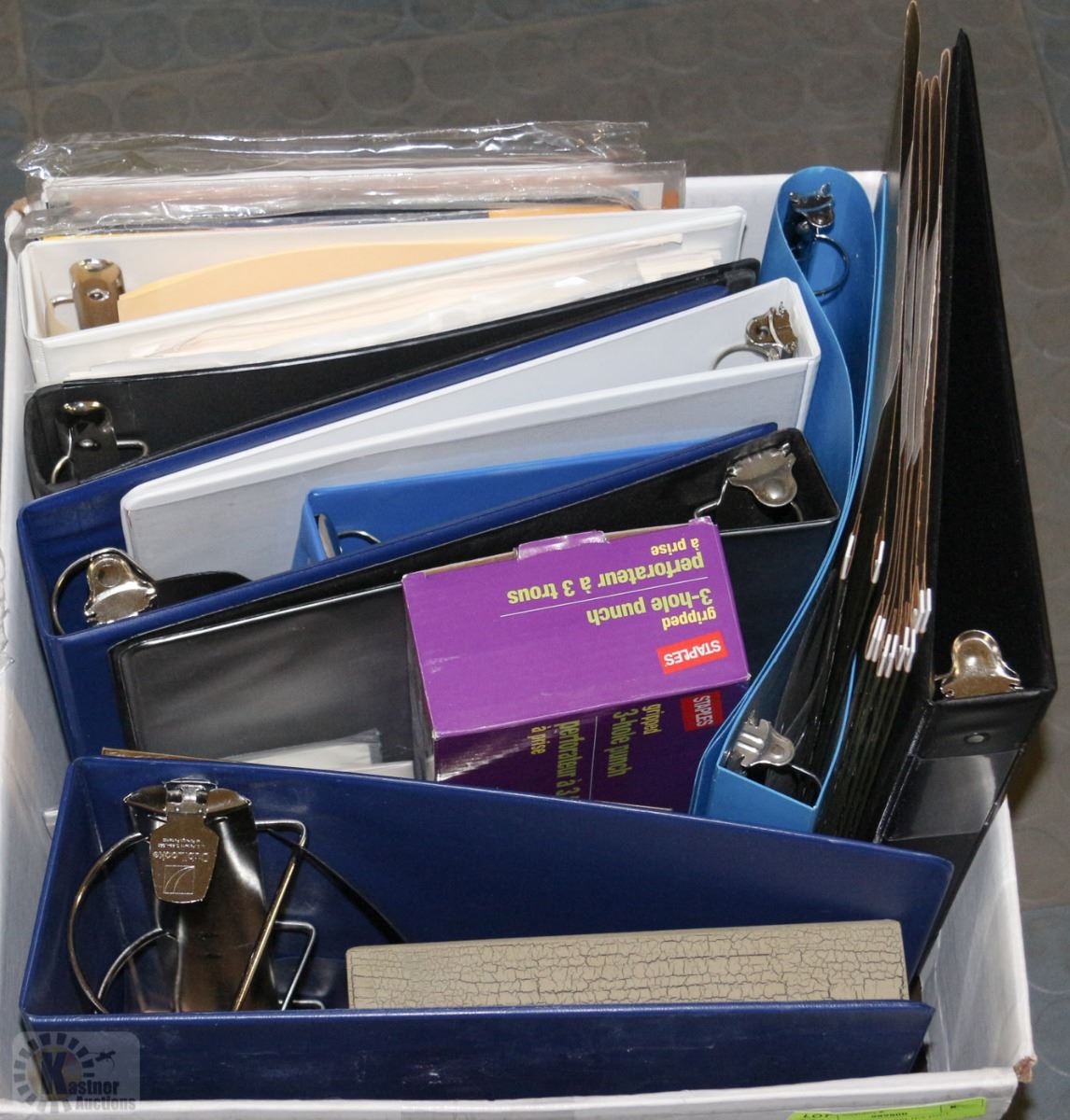BOX OF OFFICE SUPPLIES INCL BINDERS ETC