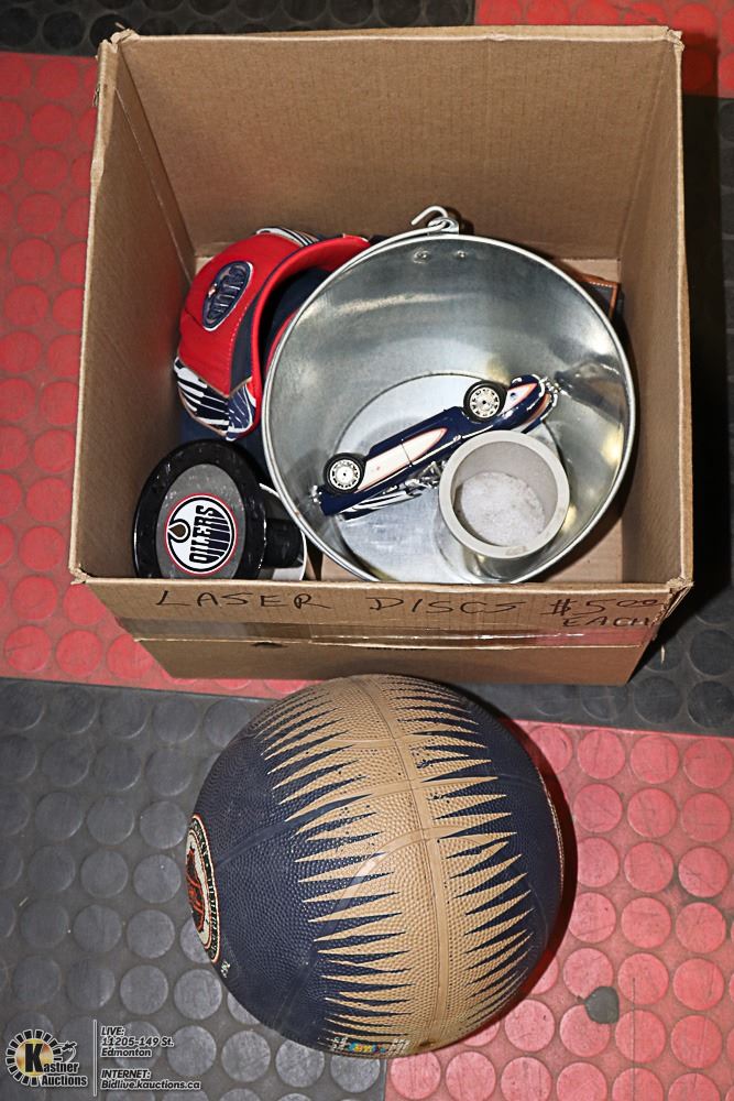 BOX OF OILERS COLLECTIBLES INCLUDES BASKETBALL,
