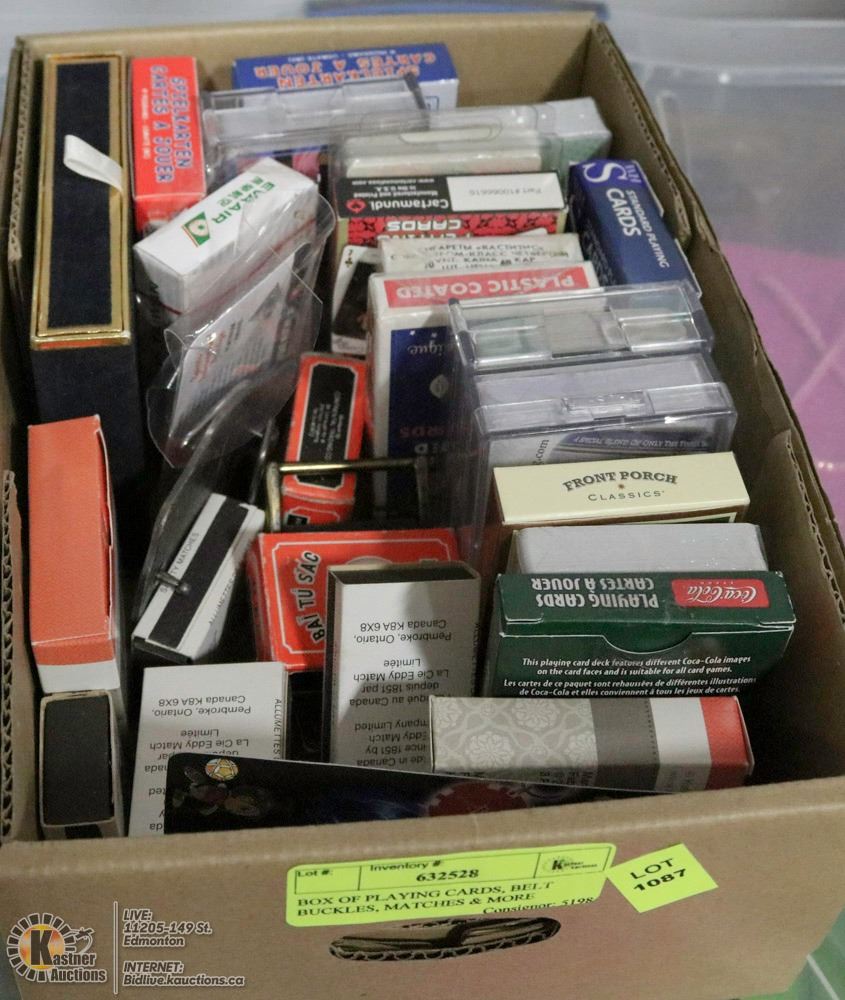 BOX OF PLAYING CARDS, BELT BUCKLES, MATCHES & MORE