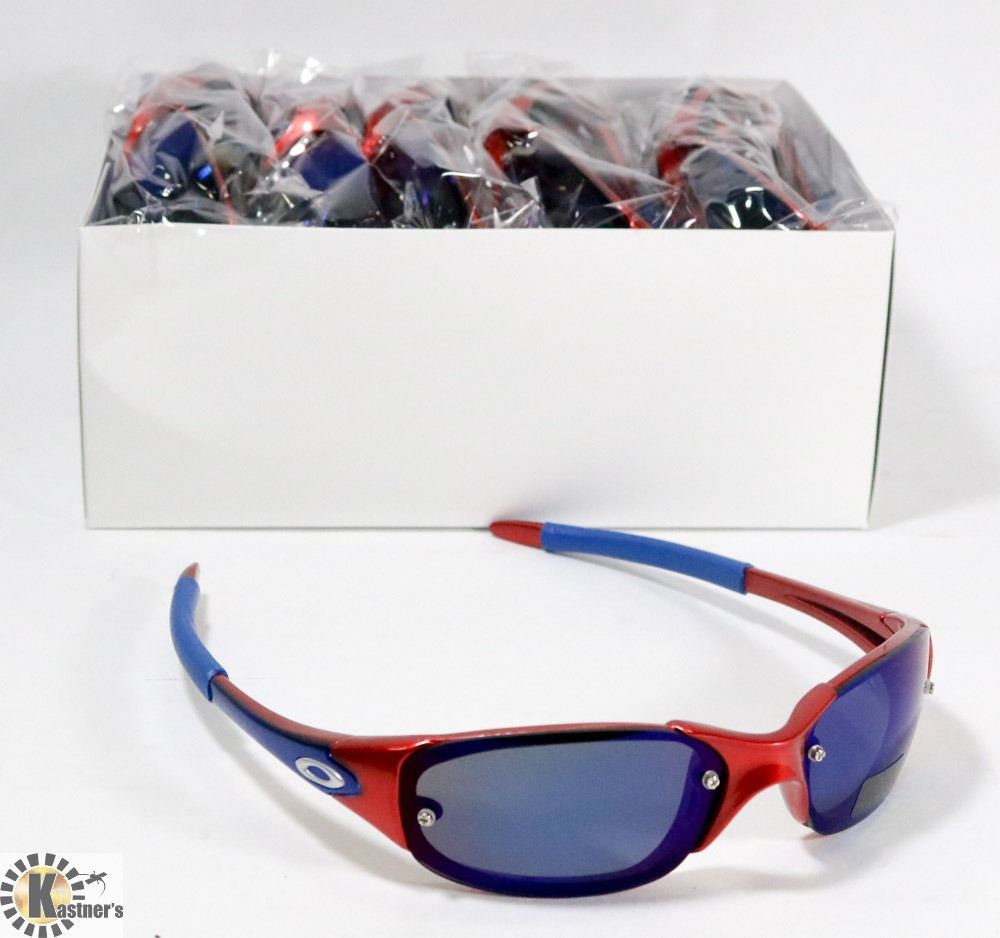 BOX OF RED AND BLUE OAKLEY STYLED SUNGLASSES