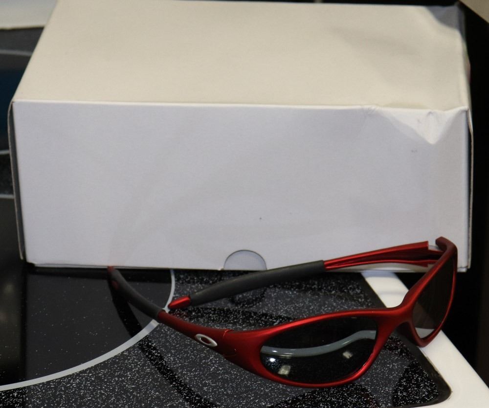 BOX OF RED OAKLEY STYLED SUNGLASSES.