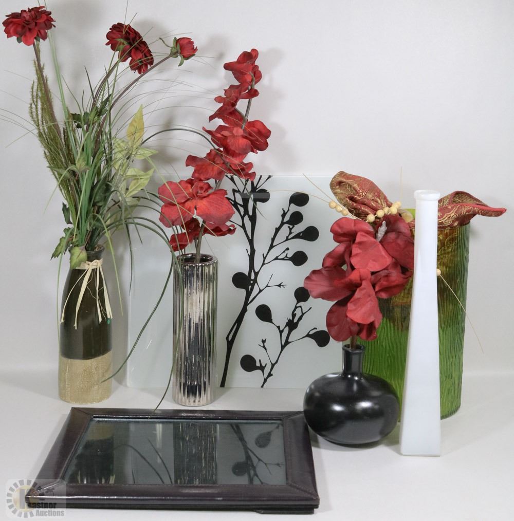 HOLDERS AND RED SILK PLANTS, PICTURE FRAME, WHITE GLASS PLATE AND VASE