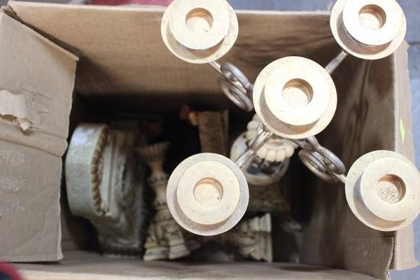BOX OF SHOWHOME DECORATIONS/CANDLE HOLDERS ETC