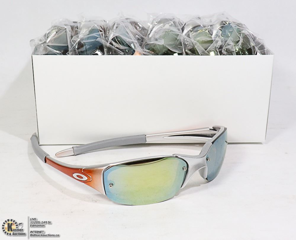 BOX OF SILVER AND ORANGE OAKLEY STYLE SUNGLASSES