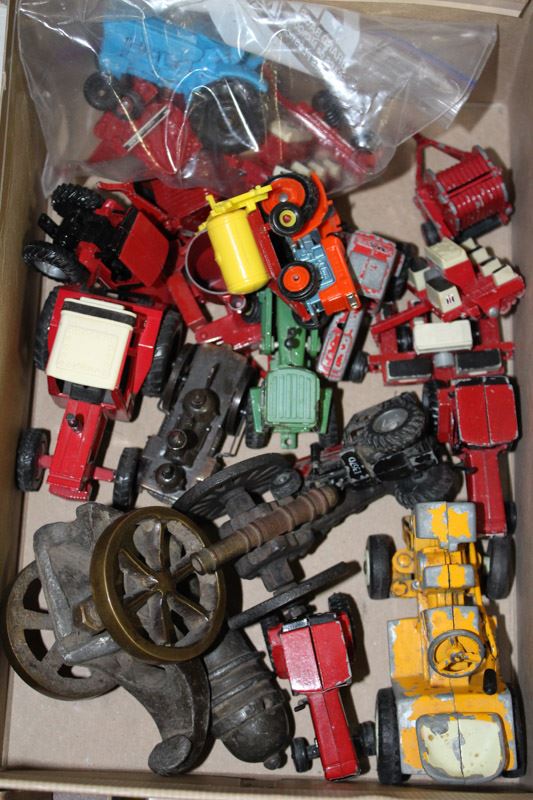 BOX OF SMALL DIE CAST TRACTORS & ACCESSORIES