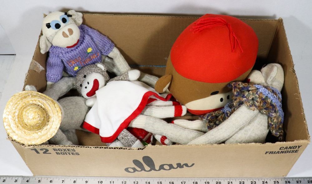 SOCK MONKEY DOLLS (HAND MADE ORIGINALS), LARGE SOCK MONKEY PILLOW, BABY SOCK MONKEY BLANKEY, SOME HAVE NEW TAGS