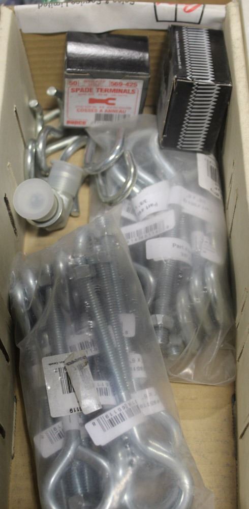 BOX OF SPADE TERMINALS, EYE BOLTS, HOOKS AND MORE