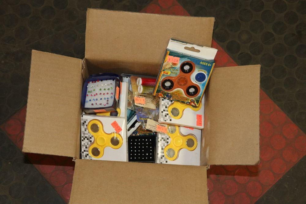 BOX OF SPINNERS AND DOLLAR STORE ITEMS