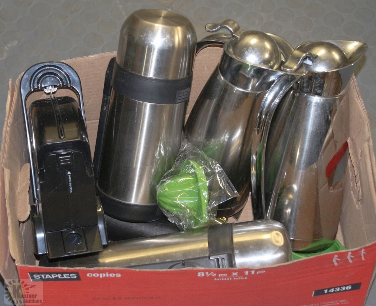 BOX OF THERMOS'S, BAGEL SLICER,SILVER CARAFES