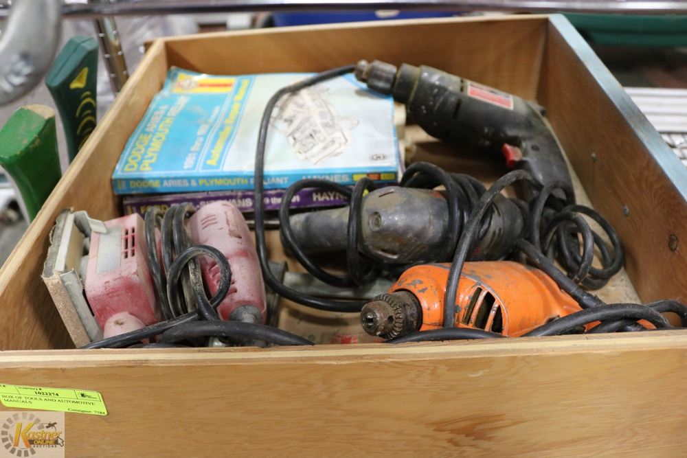 BOX OF TOOLS AND AUTOMOTIVE MANUALS