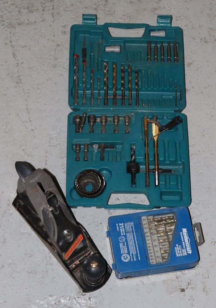 BOX OF TOOLS INCLUDING DRILL BITS, PLANER, AND