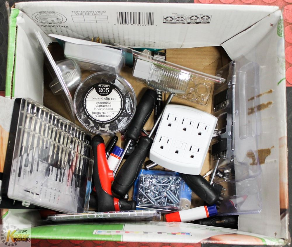 BOX OF TOOLS, LIGHTS, ELECTRICAL OUTLETS AND MORE
