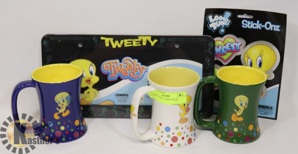 NEW LICENSE PLATE, TWEETY CAR STICKERS, AND 3 TWEETY HOT CHOCOLATE MUGS
