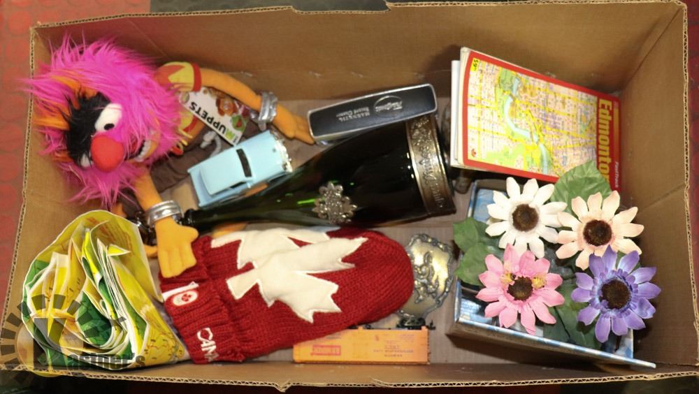 ITEMS INCL. DISNEY MUPPETS "ANIMAL", NEW CANADA WINTER OLYMPIC KNIT MITTENS (XL), VINTAGE SPRING-LOAD DIE CAST CAR, VINTAGE CHAMPAIGNE BOTTLE, NEW YORK CITY MAP, NEW DANCING FLOWER POT (WKG), VINTAGE TRANSONIC RECORD CLEANER, PONY EXPRESS BELT BUCK
