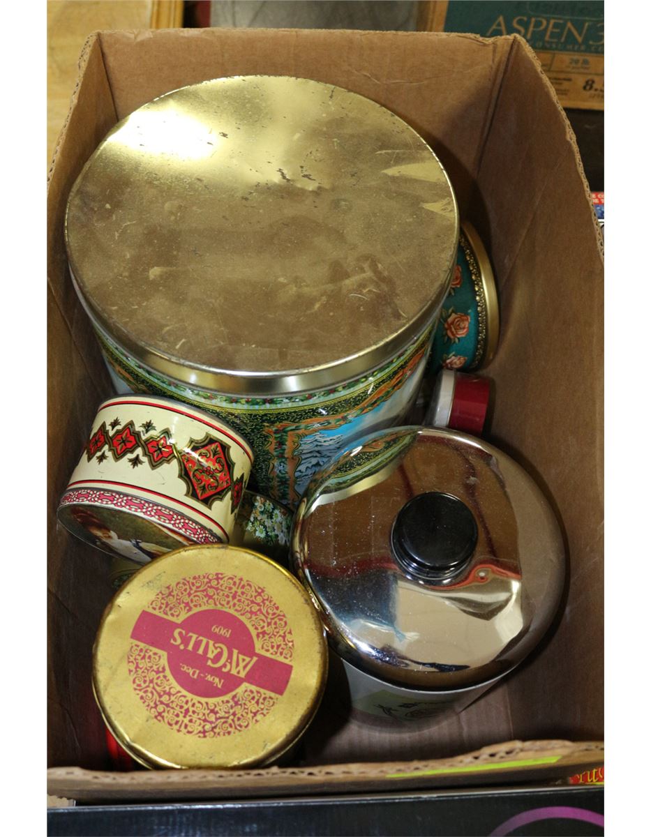 BOX OF VINTAGE COLLECTIBLE TIN CANS