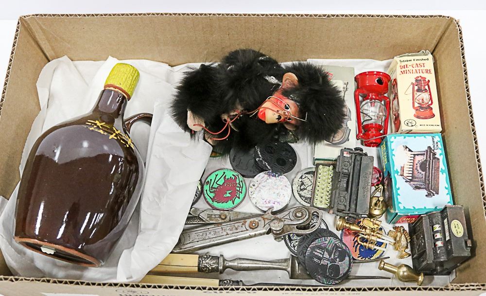 SHARPENERS (3 WITH BOXES), BRASS MINIS, 12 POGS, FORK & BLADE HONER SET, VINTAGE CAN OPENER & SCISSORS, VINTAGE SAKI BOTTLE
