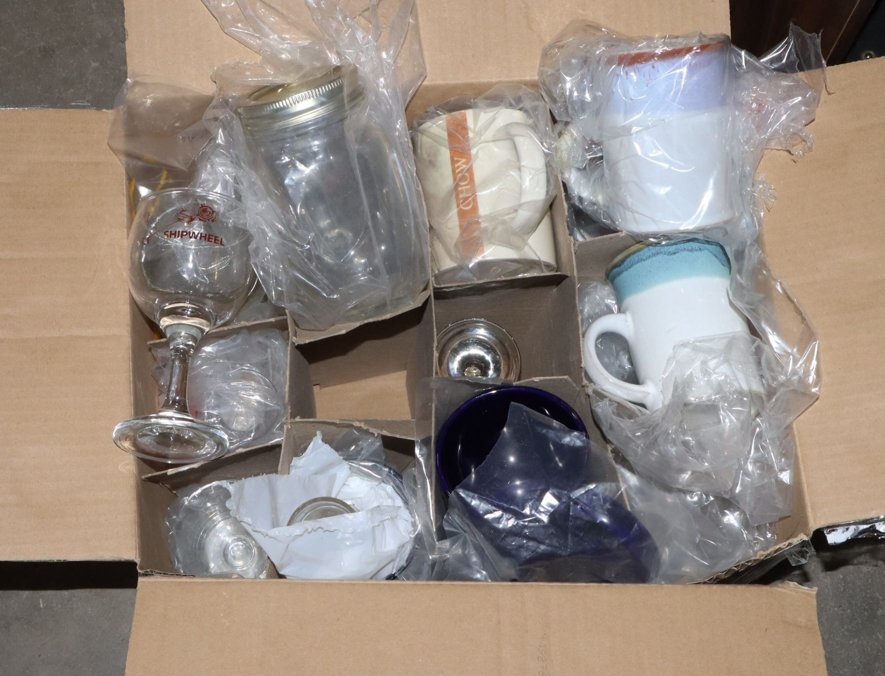 BOX OF VINTAGE ESTATE GLASSWARE, COFFEE MUGS, ECT