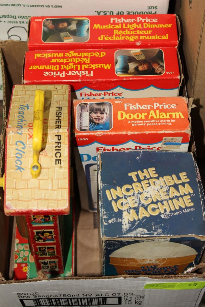 BOX OF VINTAGE FISHER PRICE SAFETY ITEMS AND TOYS